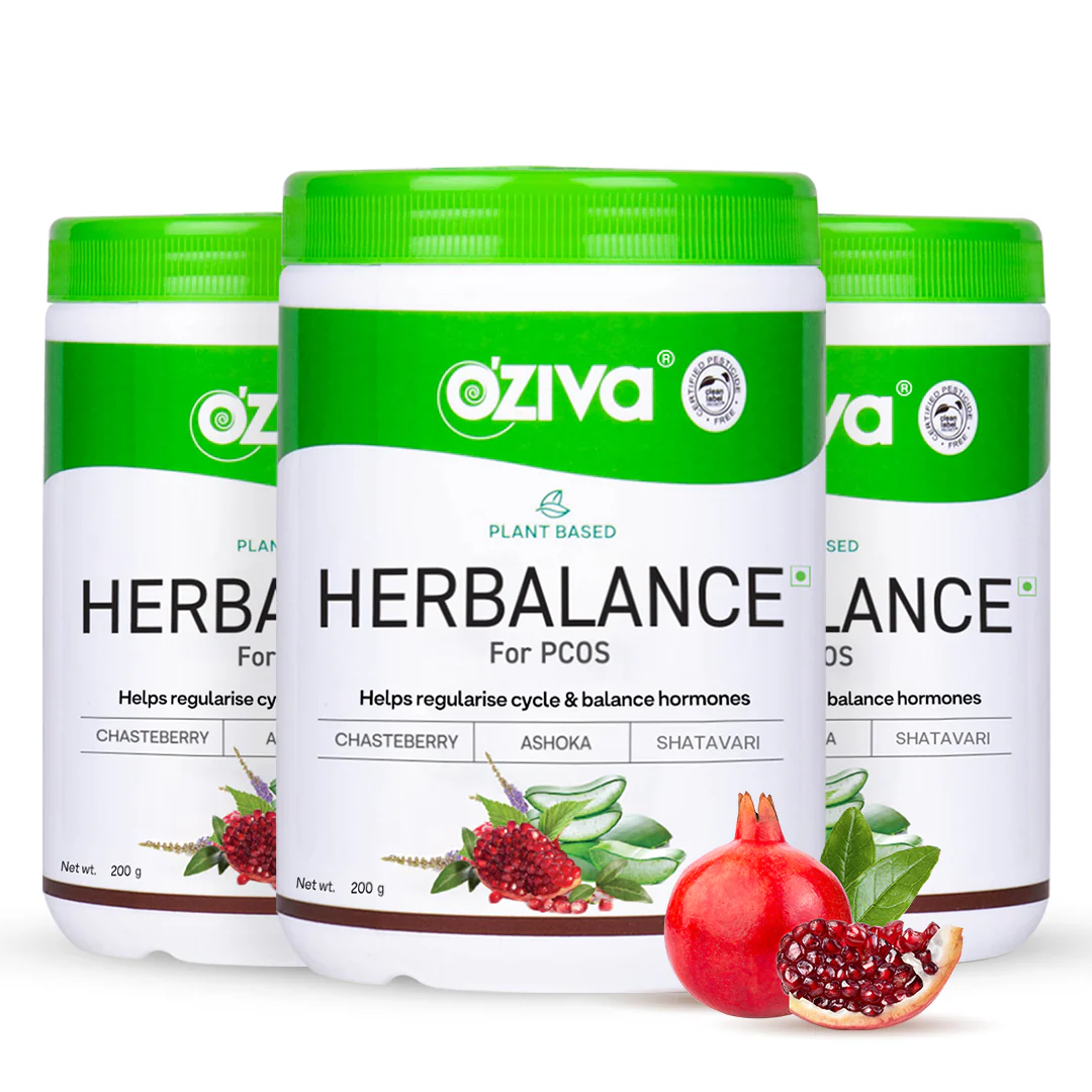Around 1 in every 5 women is diagnosed with Polycystic Ovary Syndrome (PCOS). Choosing a clean, plant-based solution that takes care of multiple PCOS symptoms at once is the best way of treating it. OZiva Plant Based HerBalance for PCOS are Certified Clean and Vegan PCOS supplements of 8 potent Herbal extracts, 6, potent herbs, Inositol and chromium, and 2 digestive enzymes to assist hormonal balance and support regular menstrual cycle in women.