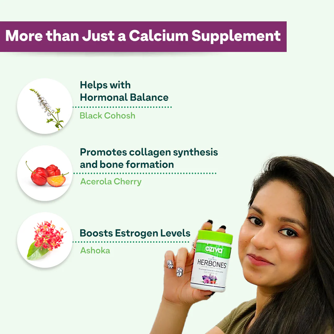 - Better Bone Health with OZiva HerBones: Supports 2X improved bone mineral density and bone protection* to support overall better bone health in women with NatCaZen, a proprietary blend with plant-based Calcium.